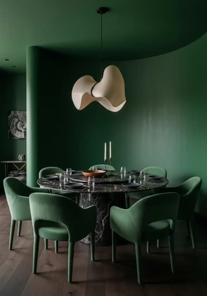 The dining room is the space in the home where the architecture of gathering matters most — where the physical arrangement of walls, ceiling, table, and chairs either supports or undermines the human activity of coming together to share food and conversation — and a curved dark wall around a circular table achieves an architectural and social harmony that is deeply, profoundly satisfying. The curve makes the wall feel like an embrace rather than a boundary, turning the dining area into a room within a room, an intimate sphere of warmth and enclosure within the larger domestic environment. Deep forest green, charcoal, or midnight navy on a curved wall adds the moody atmospheric depth that transforms this architectural feature from interesting to genuinely breathtaking.