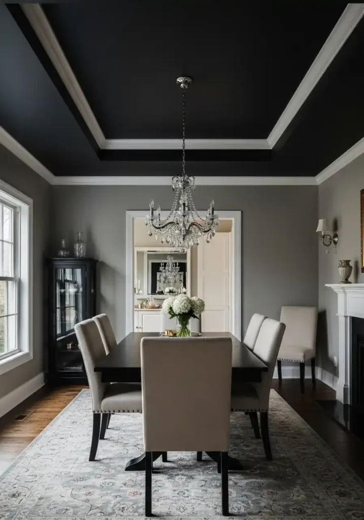A deep charcoal, near-black ceiling above a dining room creates what designers call the jewel-box effect — the sensation of being enclosed within a beautiful, richly finished container where every surface has been considered and every detail has been deliberate. The ceiling comes down visually, making the room feel more intimate and more enveloping, which is precisely the atmosphere most conducive to long, unhurried, deeply enjoyable shared meals. A crystal chandelier hanging from a dark ceiling achieves a visual effect of extraordinary beauty — each crystal catching the light against the deep dark background overhead and sparkling with an intensity and brilliance it could never achieve against a white ceiling. This single change transforms a dining room entirely.