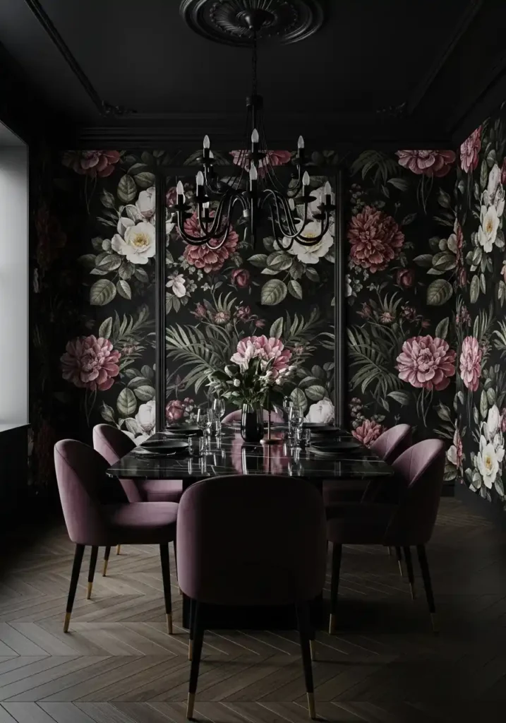 Dark floral wallpaper is the moody dining room design element that makes the biggest impact with the single most decisive visual gesture available in interior decorating — and the dining room is the one space in the home where its full dramatic potential can be most completely and most beautifully realized. Covering all four walls of a dining room in a rich, oversized botanical wallpaper with a near-black or deep jewel-tone background creates an immersive experience that is unlike anything a painted wall can achieve — you are no longer sitting in a room, you are sitting inside a dark garden, surrounded on all sides by blooming roses, unfolding peonies, and the shadowed depths of tropical leaves that seem to exist in a perpetual, perfect evening.