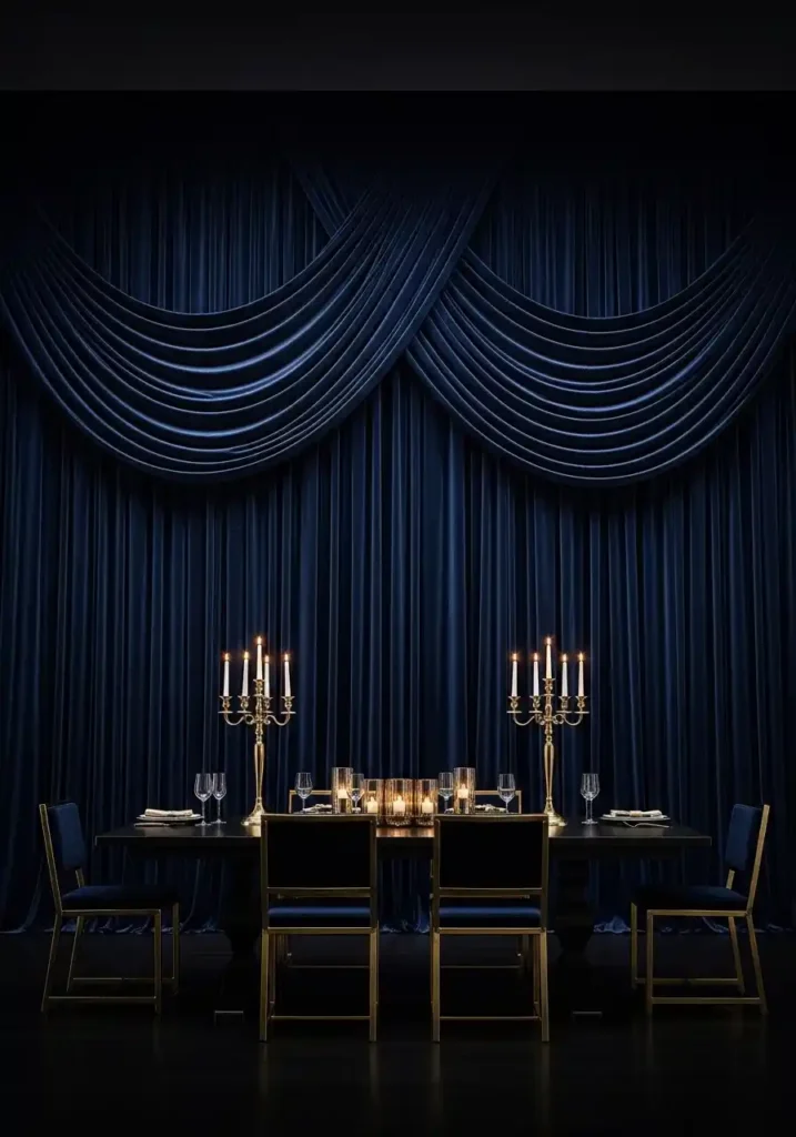 The practical magic of wall drapery in a dining room, beyond its theatrical aesthetic impact, is its ability to add warmth and sound absorption to a room that would otherwise suffer from the hard-surface acoustic problems common to dining rooms with hard floors and minimal soft furnishings. Deep velvet drapery absorbs sound beautifully, reducing the echo and reverberation that make conversation difficult in hard-surfaced dining rooms and creating an acoustic intimacy that encourages the kind of close, unhurried conversation that the best dining room atmospheres exist to enable. Position tall gold candelabras in front of the draped wall to create a composition of candlelight and rich fabric that is genuinely, unreservedly magnificent.
