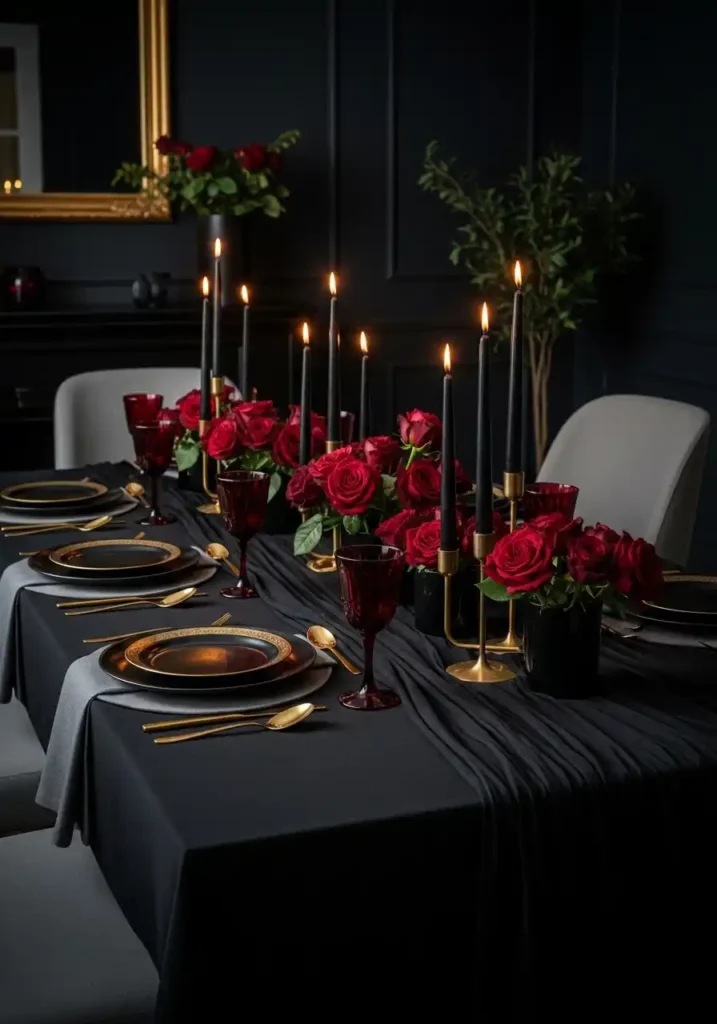 The elements of a perfect moody table styling begin with the foundation layer: a dark table runner in matte black linen or deep charcoal velvet that runs the full length of the table and anchors everything above it with a clean, decisive dark base. Black or very deep navy dinner plates with gold or brass rim detailing sit on textured charcoal placemats, creating a richly layered place setting of genuine visual complexity and elegance. Tall black taper candles grouped in odd numbers at the center of the table at varying heights provide the essential warm, flickering light. Dark garden roses, black dahlias, or deep burgundy ranunculus in small, simple black vessels scattered between the candle groupings add the living, organic world’s most beautiful contribution to the most beautiful table in the most beautiful room.