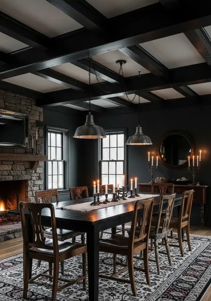 The rustic elements in a dark-beamed moody dining room are what prevent the design from feeling architectural and cold rather than warm and genuinely inviting. A large farm-style dining table in aged, characterful wood — showing its grain and its history openly — grounds the room with organic warmth that no sleek contemporary table could provide in this context. Mismatched vintage chairs around the table reinforce the room’s collected, evolved character. A stone fireplace visible in one corner completes the picture with the most elemental possible source of warmth and light. On evenings when the fireplace is lit and the candles are burning, this room is the most beautiful, most ancient, most deeply human place in the entire house.