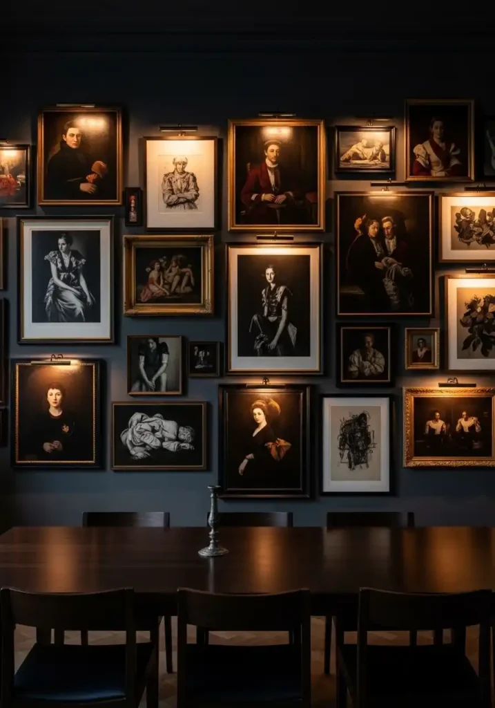 Curating a moody dining room gallery wall requires both a collector’s instinct and a designer’s eye — the instinct to seek out works that genuinely move and excite you, and the eye to arrange them in a composition that reads as coherent and intentional rather than random and accumulated. Restrict your frame colors to two families — perhaps all black frames and all dark gilded frames — so the gallery has a visual consistency that allows the diversity of the artworks themselves to be the feature rather than the variety of their presentation. Individual picture lights mounted above each significant artwork cast a warm, directional glow across the paintings that makes the gallery wall look like a museum installation and the dining room feel like the most culturally enriched, most beautifully considered room in the entire home.