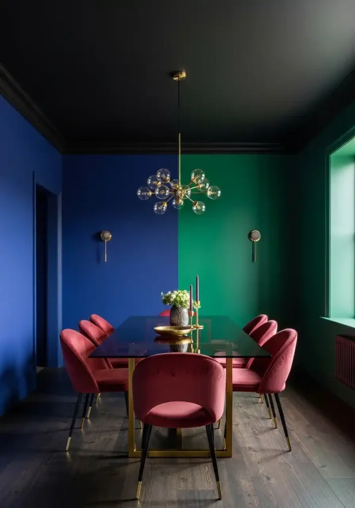 Jewel-tone color blocking in a moody dining room is the design decision that takes the single-color dramatic dining room concept and elevates it into something that feels more like a curated artistic installation than a decorated domestic space — and the results, when executed with genuine color confidence and real design intelligence, are among the most visually thrilling and most completely memorable dining rooms being created in contemporary interior design anywhere in the world. Color blocking uses the architecture of the room — its individual walls, its ceiling, its floor — as a canvas for a bold, multi-color composition that makes the space itself feel like the most significant artwork it contains.