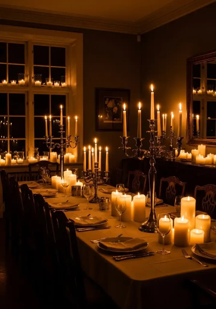 Designing a dining room specifically for candlelight-only entertaining is one of the most rewarding and most distinctive hospitality investments you can make in your home — and it requires a few deliberate decisions that go beyond simply placing candles on the table. The walls should be dark enough that the contrast between the candlelit table and the surrounding room is dramatic and intentional rather than simply gloomy — deep charcoal, navy, forest green, or burgundy all work magnificently. Multiple sources of candlelight at different heights — tall tapers in candelabras, medium pillar candles on the sideboard, small votives scattered across windowsills and shelves — fill the room with light from multiple directions and eliminate the harsh shadows that a single light source creates. The result is a room that looks like a painting from the Dutch Golden Age and feels like the most romantic place on earth.
