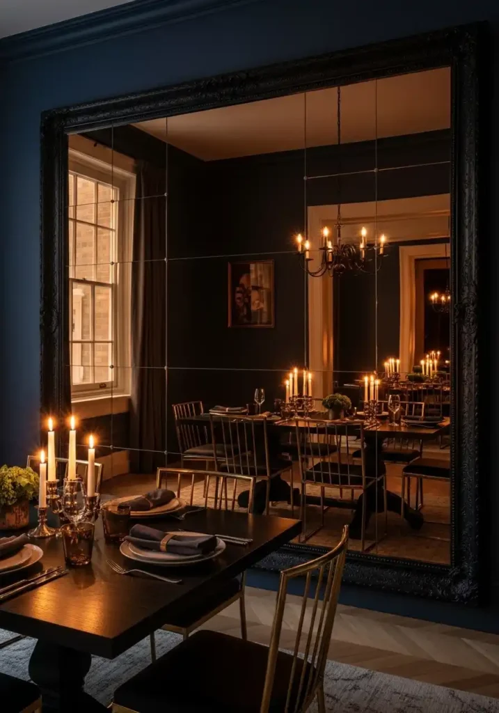 The frame of a large dining room mirror is as important as the mirror itself — in a moody, dramatically decorated dining room, the frame must be substantial enough to hold its own against the richness of the surroundings. An ornate gilded baroque frame adds unambiguous glamour and historical resonance. A thick, rough-hewn dark wood frame brings organic weight and rustic sophistication. A slim, precise black metal frame makes a clean contemporary statement. In every case, choose a frame that is genuinely large relative to the wall it occupies — a mirror that is slightly too small for its wall looks tentative and underwhelming in a room that demands confidence. Go large, go bold, and let the reflection do its extraordinary work.