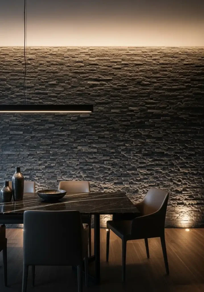 The most extraordinary dark stone dining room walls are those where the stone’s natural surface texture is preserved and celebrated rather than honed smooth — the cleft surface of split slate, with its dramatic variation in plane and its deep shadow lines, creates a wall of three-dimensional visual complexity that changes completely as the angle and quality of light shifts throughout the day and evening. Uplighting at the base of the stone wall throws warm light across its textured surface from below, producing dramatic shadows that emphasize every ridge and hollow in the stone and make the wall appear almost to be alive in the shifting light. Against this raw, primordial backdrop, a sleek black marble dining table reads as the perfect contemporary counterpoint.
