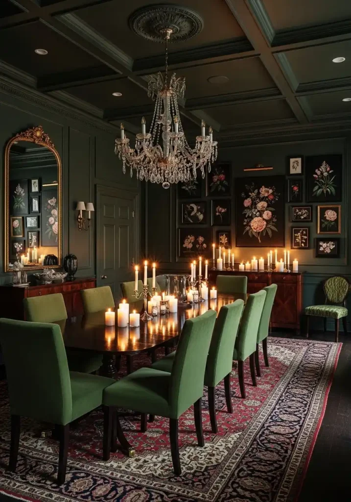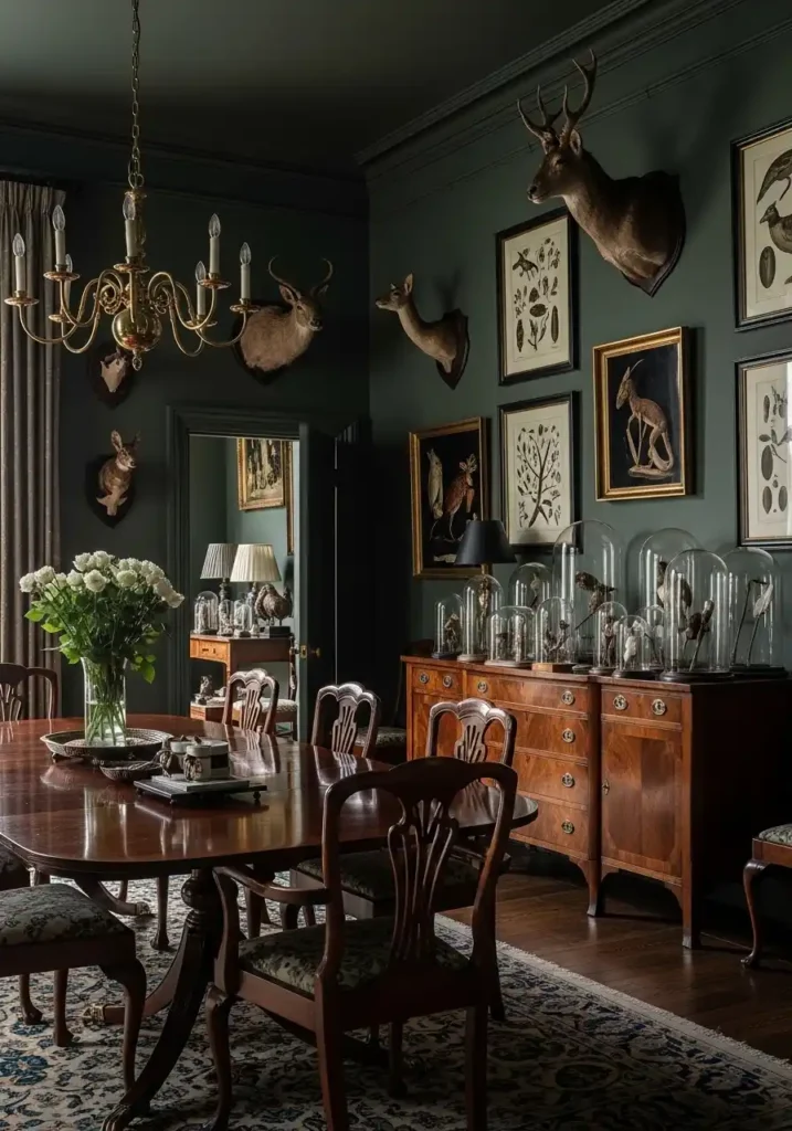 The Victorian aesthetic that underpins this moody dining room style understood something that contemporary minimalism has somewhat forgotten: that the natural world is endlessly, inexhaustibly beautiful, and that surrounding yourself with its evidence — preserved specimens, scientific illustrations, mounted antlers, glass-domed curiosities, botanical engravings — creates an environment of genuine intellectual richness and visual complexity that makes a room feel inhabited by a curious, engaged, and deeply interesting mind. Dark forest green walls provide the perfect backdrop for this collection of natural wonders, referencing the green world from which the specimens came. A mahogany dining table grounds the room in the warmth of organic material, and an antique brass chandelier casts the whole magnificent scene in the warm, appropriate light of a different century.
