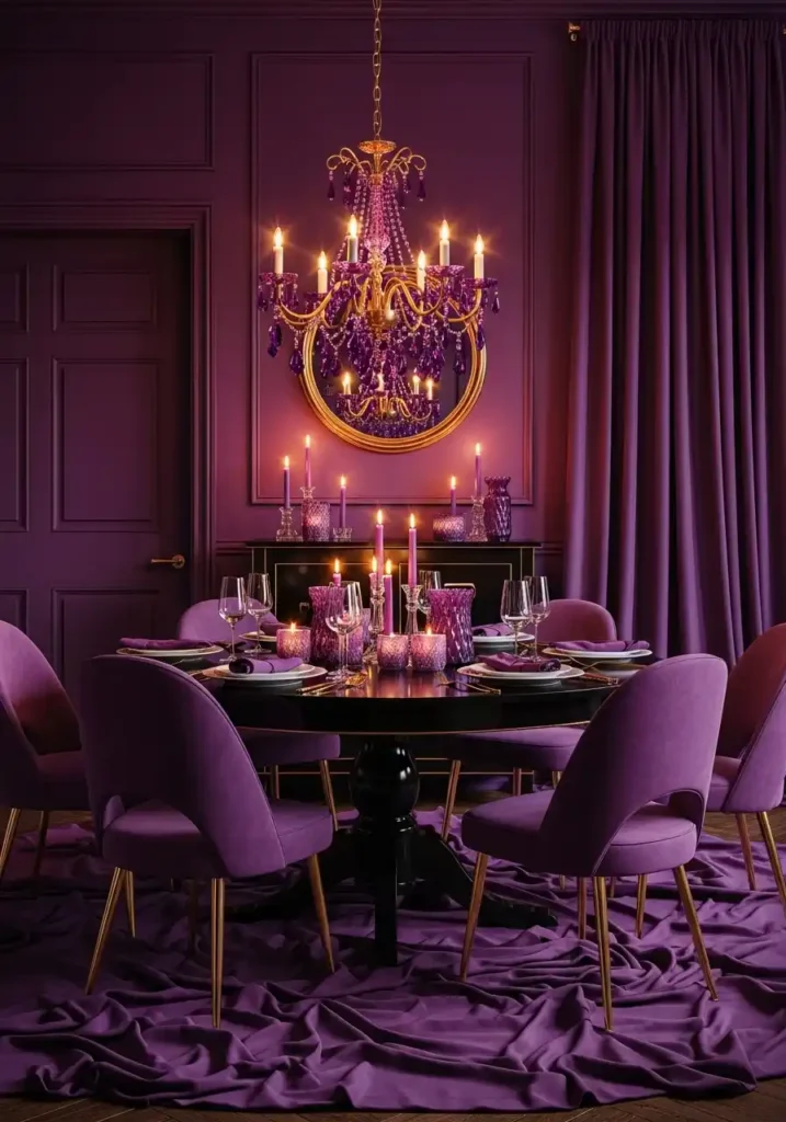 The drama of a plum dining room reaches its absolute peak in evening and candlelight conditions — and this is the room that genuinely, substantially changes personality after dark in the most extraordinary and most beautiful way. The warm amber of candle flames reacts with the deep purple-red of the walls to produce a quality of light that is unlike anything produced by any other color combination — a warm, slightly luminous glow that makes every face at the table beautiful, every conversation feel intimate, and every meal feel like an occasion of genuine celebration and pleasure. Purple silk curtains pooling generously on the floor add a theatrical, almost stage-like quality that is perfectly suited to a room this dramatically beautiful.