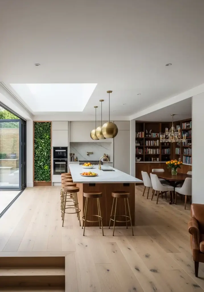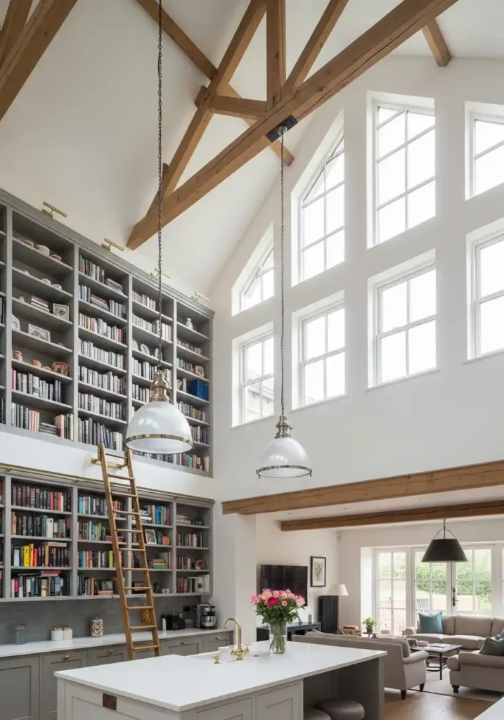The floor-to-ceiling bookshelf wall that uses the full height of the double-height volume — accessed by a rolling brass library ladder that spans the complete width of the shelving — is the architectural element that most completely transforms the double-height wall from an impressive but potentially overwhelming vertical surface into a warm, inhabited, deeply beautiful feature of extraordinary domestic character. The library wall’s combination of books, brass ladder, and warm wood shelving creates a feature of such complete intellectual richness and such genuine architectural warmth that the double-height kitchen and living space feels not like a grand public interior scaled to domestic use but like the most magnificently, most personally resolved private home imaginable.