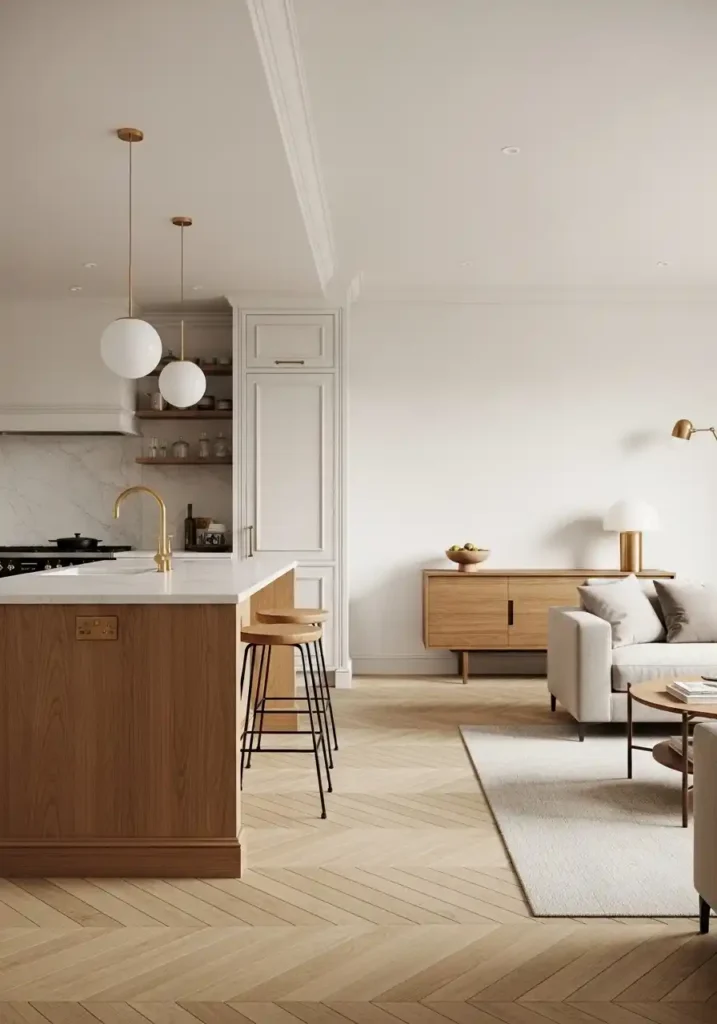 The warm honey oak herringbone floor is the material element whose consistent presence throughout all three zones most powerfully and most practically unifies the combined open plan — because the herringbone floor pattern, with its dynamic, directional geometry of interlocking rectangular wood pieces, creates a surface of such complete visual energy and such consistent organic warmth that its presence in every zone simultaneously ensures that every zone feels part of the same beautiful whole regardless of the individual design choices made above floor level. The floor is the open plan’s most powerful unifying element because it is always, simultaneously, in every zone, under every foot, and in every field of vision.
