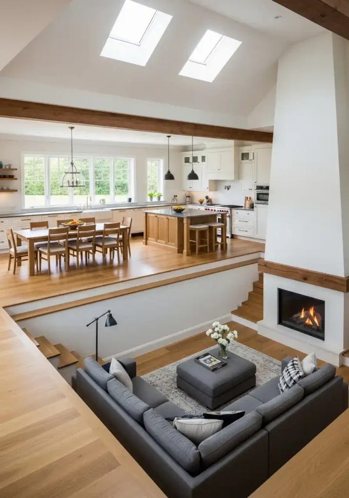 A sunken living area within an open kitchen concept is the spatial device that creates the most dramatic, the most architecturally sophisticated, and the most completely memorable zone definition available in contemporary residential design — because a single step down from the kitchen and dining level into a sunken living conversation pit creates a zone separation of genuine physical and atmospheric completeness without any wall, any partition, or any physical barrier of any kind. The change in floor level establishes the living zone’s distinct identity and its distinct atmosphere with an architectural clarity and a spatial drama that no furniture arrangement, no rug, and no color change can approach with the same completeness or the same authority.