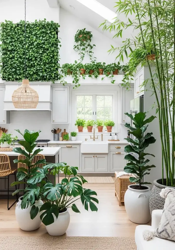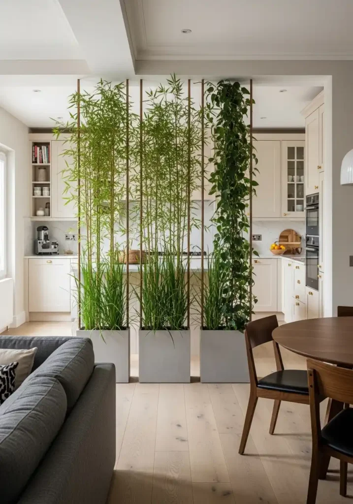 The specific plants chosen for open kitchen zone dividers must be selected for their specific combination of visual impact at the height and scale required, their tolerance for indoor light conditions, and their specific quality of creating the right degree of visual permeability — enough foliage to clearly define the zone boundary without completely blocking the sightlines between zones. Tall bamboo with its elegant vertical culms and its gentle leaf movement creates the most beautiful and the most atmospherically complete living divider — its clean, architectural form establishing a clear visual boundary while its translucent foliage allows light and color from both zones to be visible through it, maintaining the open plan’s essential quality of connected, flowing space.