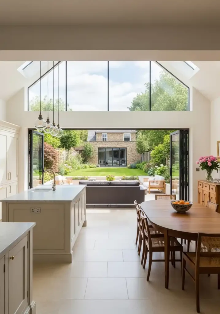 A floor-to-ceiling glass wall spanning the full width of an open kitchen and living space is the architectural intervention that most completely and most dramatically transforms the combined interior’s spatial quality — because a glass wall of full height and full width dissolves the boundary between the interior living environment and the exterior garden so completely that the two spaces merge into a single, continuous landscape of indoor and outdoor living whose combined volume and combined spatial generosity is genuinely extraordinary. The open kitchen behind a full glass wall does not merely have a view of the garden — it shares the garden’s light, its air, and its spatial generosity with complete, unmediated openness.