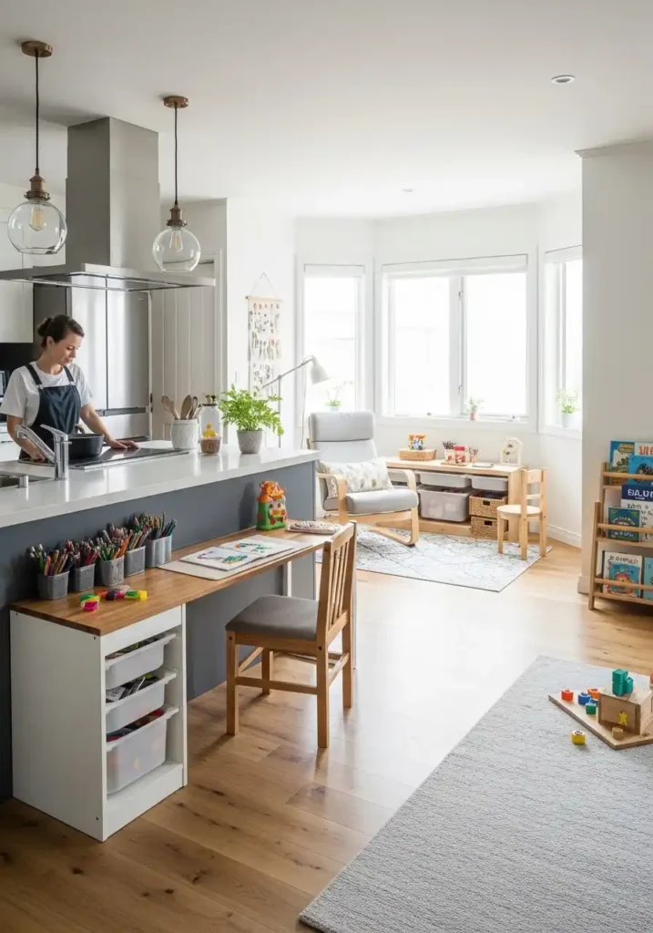 An open kitchen concept with a dedicated children’s zone positioned within the cook’s direct sightline from the island is the family living arrangement that most practically and most completely resolves the fundamental challenge of raising young children in a home where the daily work of cooking must happen simultaneously with the daily supervision, engagement, and care of children. The open kitchen facing the children’s zone allows a parent to cook a full dinner while maintaining continuous visual contact with children doing homework, reading, drawing, or playing — creating a quality of family togetherness and practical daily functionality that no closed kitchen, however beautifully designed, can approach with the same ease.