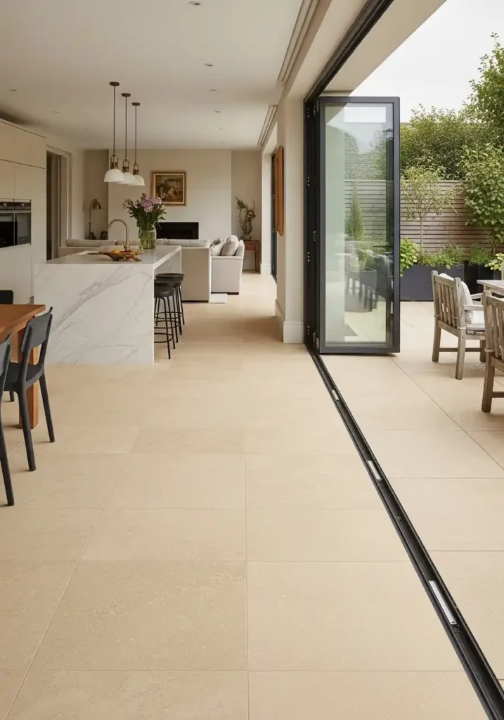 The large-format travertine tile is the specific floor material that creates the most beautiful and the most completely successful continuous indoor-outdoor floor — because travertine’s warm, slightly varied honey and cream tones with its characteristic natural variation create a floor surface of such genuine organic beauty, such geological warmth, and such complete material appropriateness to both indoor and outdoor use that it reads as equally beautiful, equally appropriate, and equally natural in both environments simultaneously. The large format of the travertine slabs — each tile spanning a generous proportion of the floor area — minimizes the number of grout lines and maximizes the continuity of the stone’s surface, creating a floor of greater visual smoothness, greater apparent scale, and greater material magnificence.