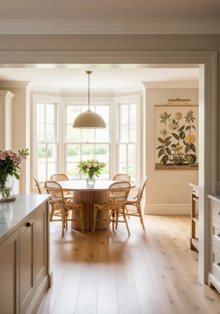 The open archway between the kitchen and the breakfast room is the architectural detail that most beautifully realizes the connected yet distinct spatial relationship — because the arch creates a genuine threshold of architectural significance between the two spaces, framing the view from the kitchen into the breakfast room as a composed, beautifully proportioned picture of the room beyond while maintaining the visual and spatial connection that makes the two rooms feel like a single, generous, connected living environment. A wide, generously proportioned plaster arch in warm white creates the most beautiful and the most architecturally accomplished connection, transforming the passage between kitchen and breakfast room into one of the home’s most beautiful interior architectural moments.