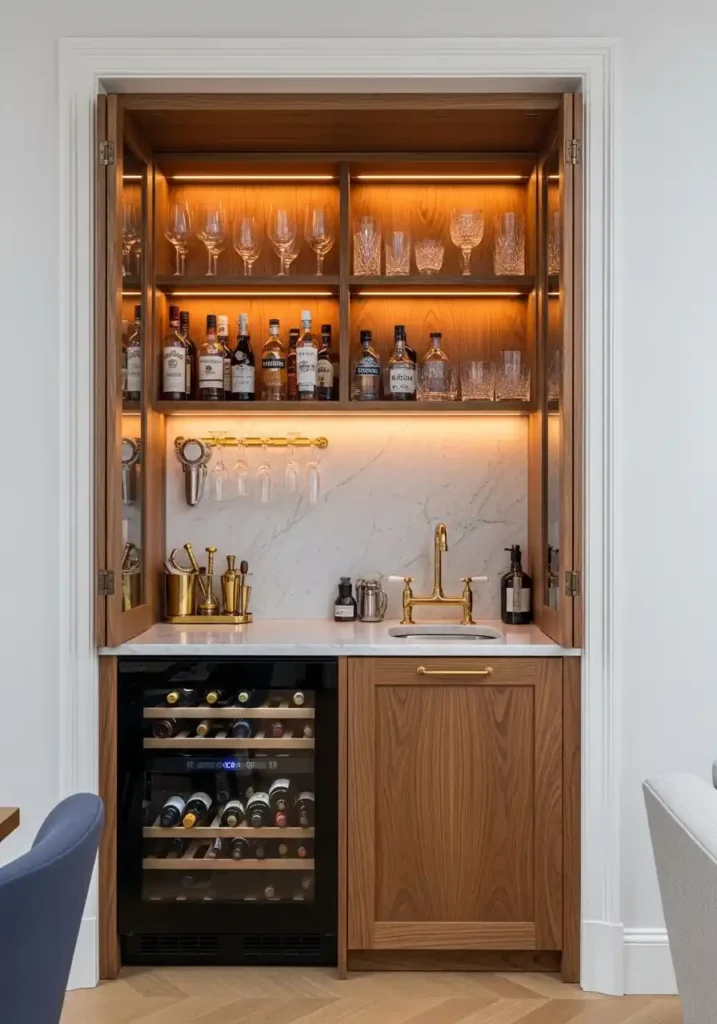 A dedicated cocktail and drinks zone positioned at the transition between the open kitchen and the living area is the entertaining infrastructure element that most powerfully and most practically completes the open kitchen concept’s social ambitions — because a properly equipped bar zone with its own dedicated counter, its own sink, its own wine refrigeration, and its own beautiful display of spirits and glassware creates a second social gathering point within the combined space that operates independently of the kitchen’s cooking activities, allowing guests to make drinks and gather at the bar zone while the host cooks at the kitchen island without the two activities competing for the same counter space or the same social territory.