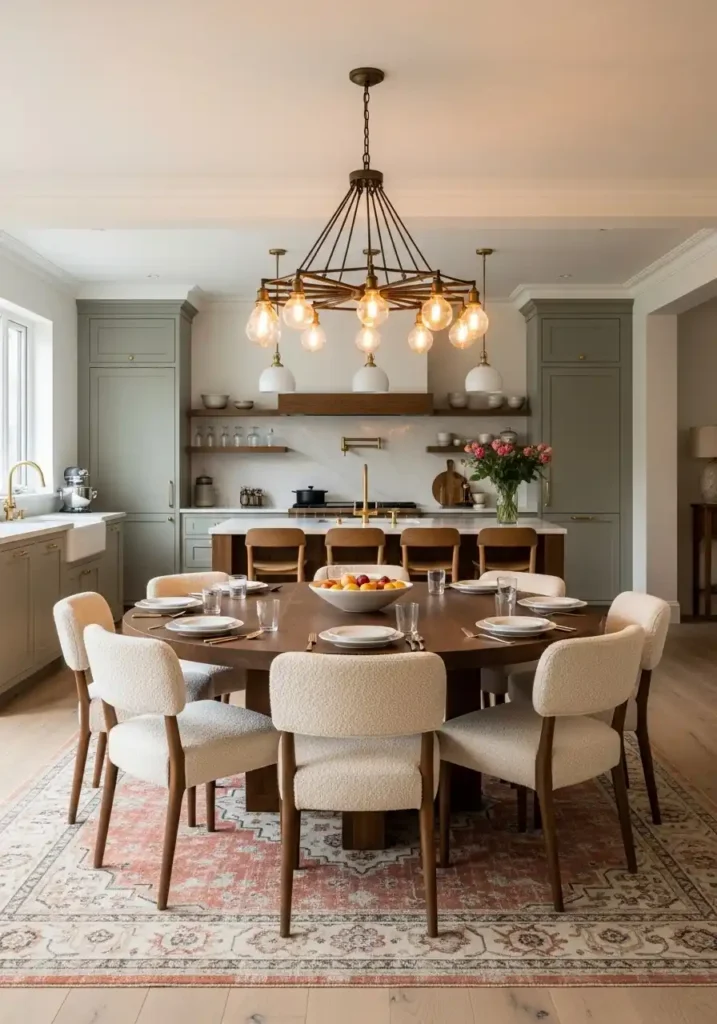 The large round dining table is the specific table form that creates the most socially generous and the most spatially successful dining zone within an open kitchen — because the round table creates a gathering of complete democratic equality with no head, no foot, and no privileged position, every diner equally central and equally part of every conversation simultaneously. The round table also creates the most favorable spatial relationship with the open plan’s flow — its absence of corners and its complete symmetry allowing people to move around it with greater ease and greater naturalness than a rectangular table of equivalent seating capacity, making the dining zone feel generous and unencumbered rather than blocked and spatially dominant.