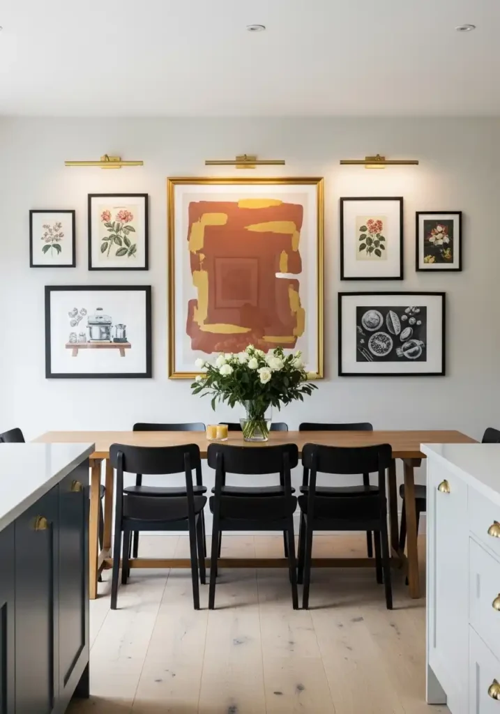 The gallery wall’s visibility from the kitchen island — across the full width of the open plan — is the spatial relationship that most meaningfully integrates the art into the daily experience of the combined living space rather than confining its contribution to the dining zone alone. A cook standing at the kitchen island or working at the stove has a direct, twenty-foot sightline to the gallery wall in the dining zone, and the daily visual relationship between the act of cooking and the beauty of genuinely good art creates a quality of aesthetic enrichment that is continuously present in the background of every cooking session, every meal preparation, and every kitchen moment, making the open kitchen genuinely more beautiful and genuinely more inspiring in its daily use.