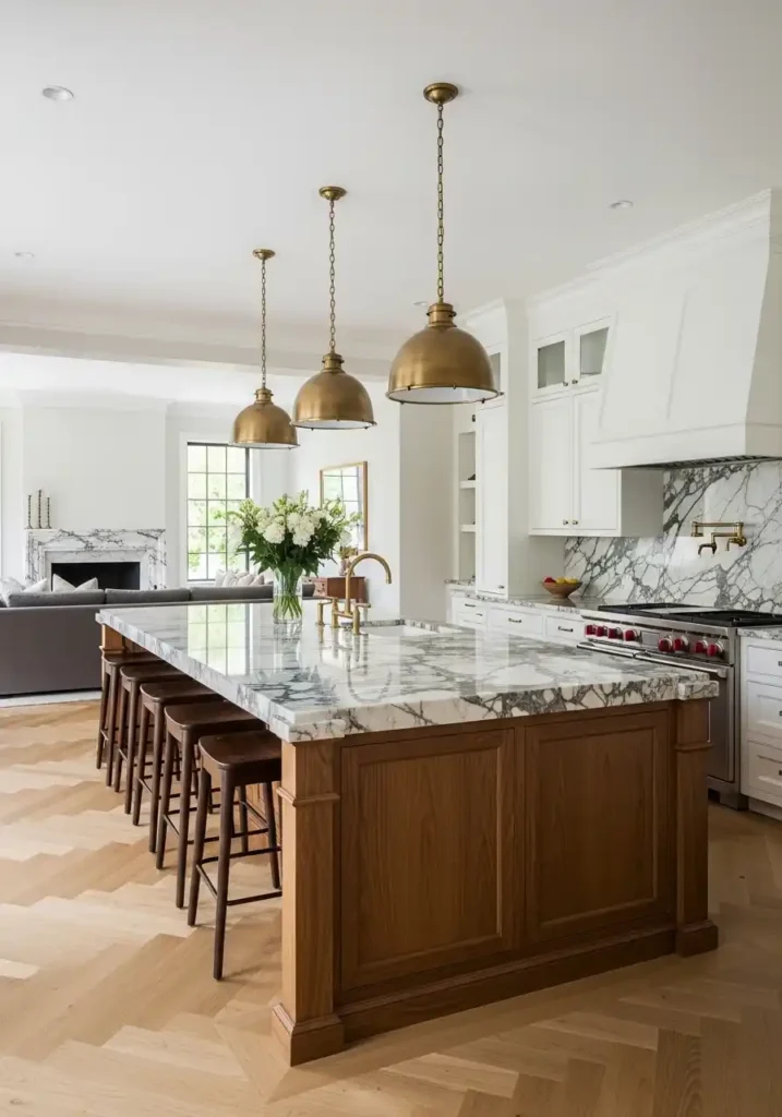 The white marble fireplace surround visible from the kitchen island creates a focal point of such complete classical beauty and such permanent architectural authority that it anchors the entire open plan’s visual composition from the living area side with the same power and the same confidence that the kitchen island anchors it from the kitchen side. The two focal points — island and fireplace — create a spatial conversation across the open plan that gives the combined space a quality of bilateral visual organization and bilateral warmth that makes every position within it feel equally considered, equally beautiful, and equally connected to the room’s two most magnificent and most warmly generous design elements.