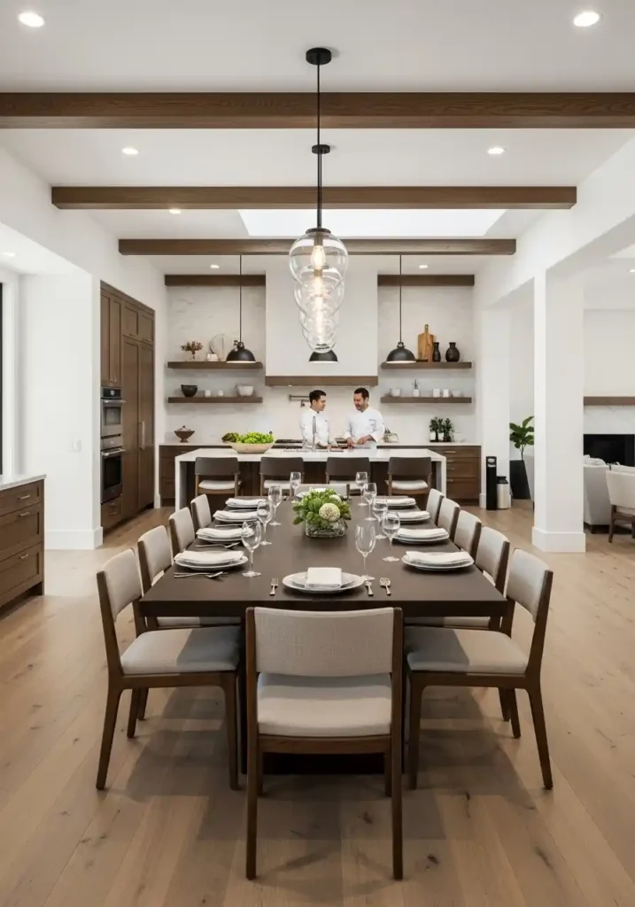 A long dining table for fourteen within an open kitchen concept designed specifically for serious entertaining is the furniture piece that most powerfully and most completely declares the combined space’s primary social purpose and its most magnificent intended use — because a table of this scale creates the specific domestic environment for the gatherings that make family and social life most rich, most memorable, and most genuinely fulfilling: the long Christmas dinner, the summer birthday celebration, the dinner party that continues past midnight with the conversation still flowing and the wine still pouring. This table is the open kitchen’s ultimate expression of its social generosity.