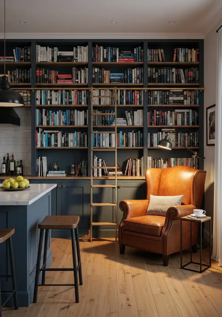 The floor-to-ceiling bookshelf wall with a rolling brass library ladder is the library corner feature that most powerfully and most visually transforms the living zone of the open kitchen concept into something genuinely extraordinary — because the full height bookshelf wall creates a feature of such intellectual richness, such material warmth of wood and paper and leather spines, and such complete, accumulated personal history in the specific titles displayed that it communicates more directly and more honestly about the person who lives within the space than any designed decorative feature could achieve with equivalent impact. Books are the most personal decoration available — and the rolling brass ladder that makes the highest shelves accessible adds an element of romantic, library-inspired charm that is genuinely, completely irresistible.