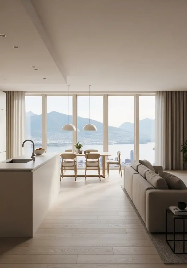 The pale, light-reflective material palette of a view-deferring open kitchen creates an interior environment of such complete luminosity and such consistent visual calm that the combined space reads as a beautifully resolved surround for the view rather than as a designed room competing with the world beyond the glass for the occupant’s attention. Warm white cabinets, pale stone countertops, light-toned furniture in quiet neutrals, and pale reflective floors create a combined interior that appears to gather and reflect the view’s specific light quality — the blue of water, the gold of mountain sunset, the silver of a city at night — rather than imposing its own color story on top of the view’s perpetually changing natural palette.