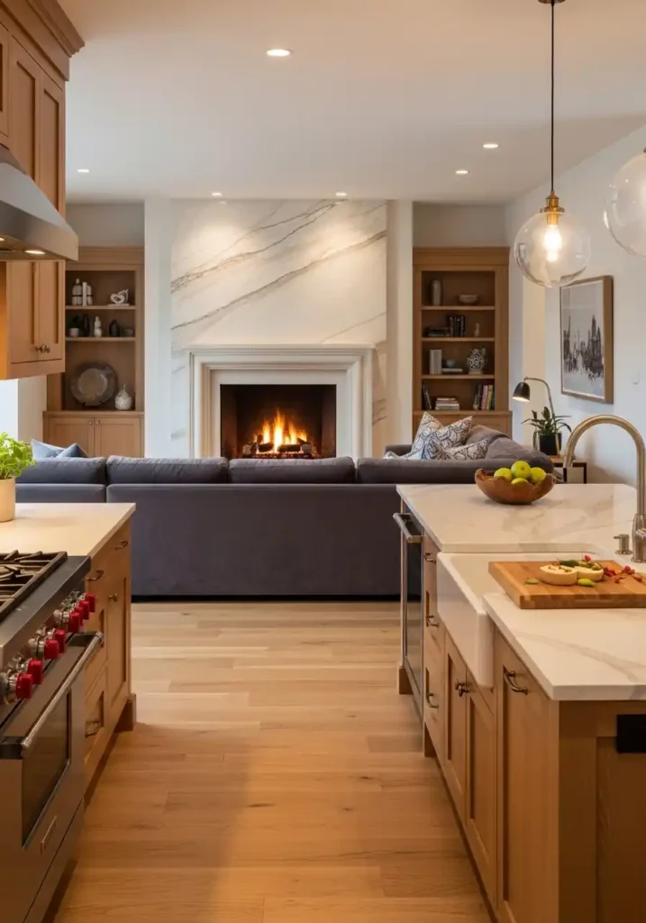 5. The Open Kitchen with a Statement Fireplace Creating Warmth
