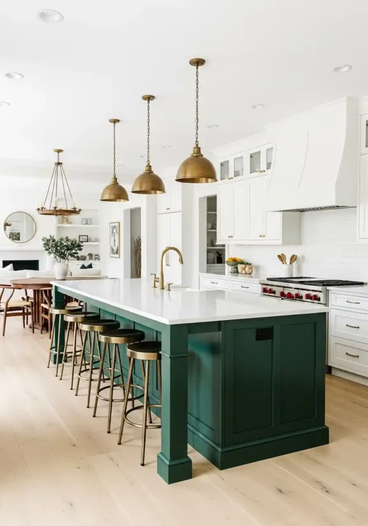 A statement kitchen island in a deep, contrasting color within the white perimeter cabinetry of an open kitchen concept is the design decision that most powerfully and most immediately gives the combined living space its primary visual anchor, its dominant design personality, and its most concentrated expression of design confidence — because a deep, saturated island color in an otherwise neutral open plan creates a focal point of such concentrated color energy and such complete visual authority that the combined space organizes itself around the island’s presence with the same naturalness and the same inevitability that a room organizes itself around a magnificent fireplace or a spectacular view.