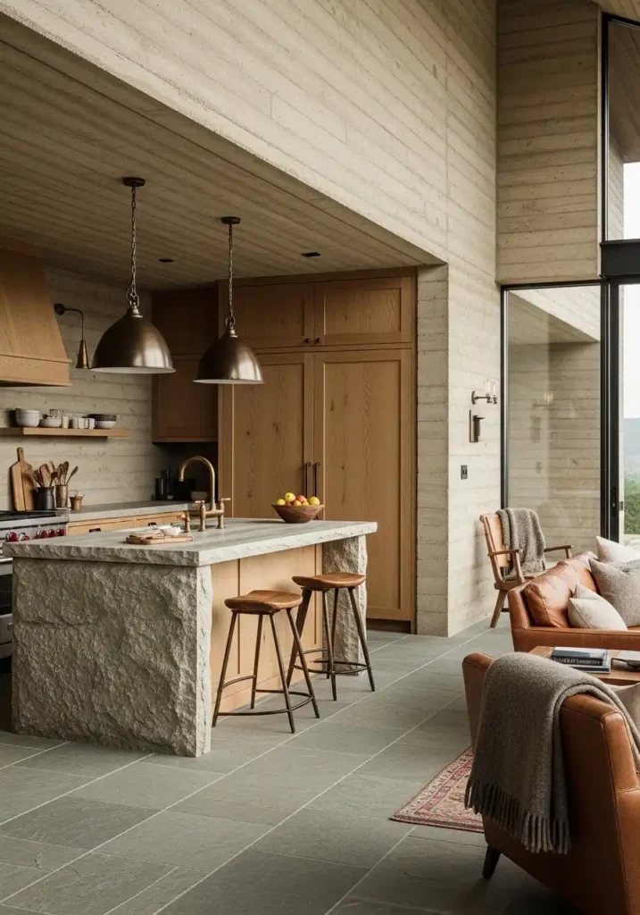 An open kitchen and living concept with an exterior-inspired material palette — where the specific materials chosen for the combined interior reference and echo the specific geological and botanical materials of the landscape visible through the floor-to-ceiling windows — is the open kitchen design approach that creates the most complete, the most genuinely immersive, and the most deeply grounding connection between the domestic interior and the natural world beyond the glass. The interior that speaks the same material language as the landscape it faces creates a quality of spatial and material continuity between inside and outside that makes the combined living space feel not like a shelter from the natural world but like a beautifully designed piece of it.