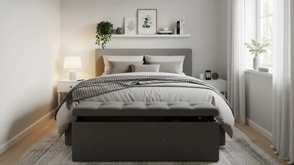 Adding a storage bench at the foot of the bed enhances organization without altering the main layout. This piece provides hidden storage for blankets, pillows, or clothing while also serving as seating. It’s a smart upgrade for small bedrooms.