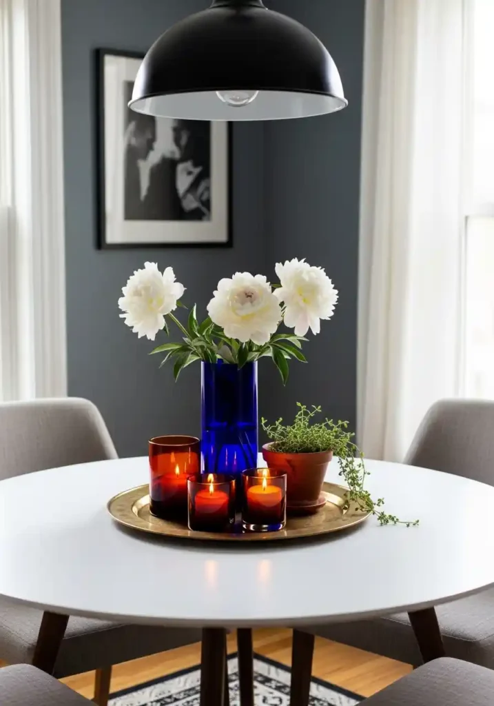The jewel-toned centerpiece approach — combining deep cobalt blue, rich amber, warm terracotta, and emerald green in a carefully composed arrangement of glass vessels, ceramic pots, and candleholders on an aged brass tray — creates a focal point of such concentrated material richness and such warm, saturated color that the entire small dining room takes on a quality of jewellike beauty and atmospheric warmth that radiates outward from the table to every corner and surface of the space. The tray is essential — it corrals all the individual elements of the arrangement into a single, unified composition that reads as a deliberate, considered design statement rather than a collection of random objects placed together on the table. Change the flowers, rotate the candles, add seasonal botanicals, and the centerpiece evolves beautifully through the year.
