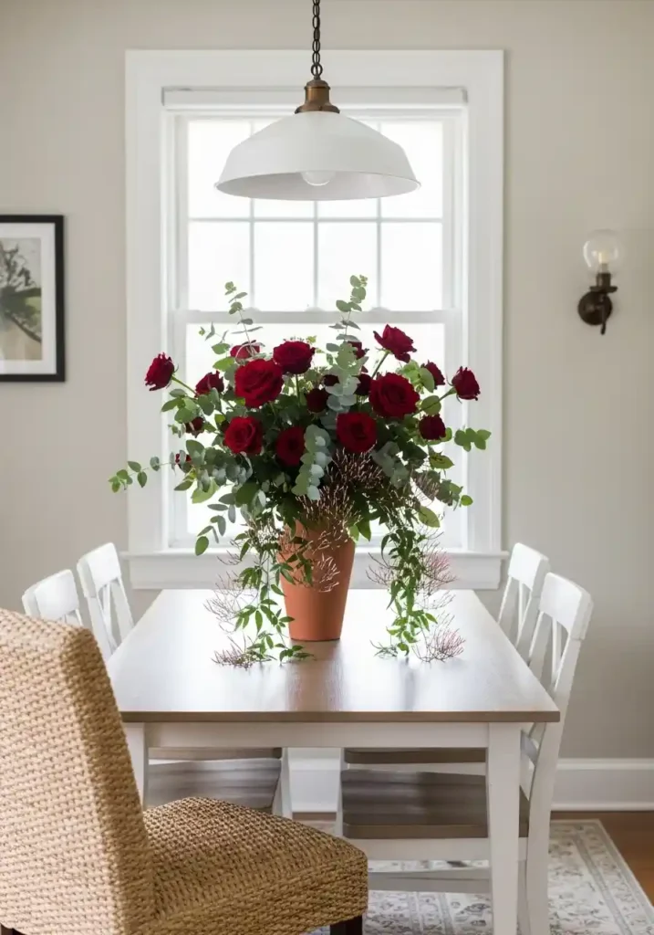 The art of a dining room floral arrangement that is both beautiful and spatially appropriate for a small room is entirely about scale and proportion — choosing an arrangement generous enough to feel genuinely impressive and genuinely celebratory while keeping it compact enough in footprint and low enough in height that it doesn’t overwhelm the table surface or block the sightlines across the table that make conversation easy and pleasurable. A wide, low arrangement in a shallow bowl or a generously filled short vase achieves this balance beautifully — maximizing the visual impact of the flowers while maintaining the open, unobstructed quality of the table surface and the unimpeded sight lines between every diner. Change the flowers weekly and the room feels constantly fresh, constantly alive, and constantly beautiful.