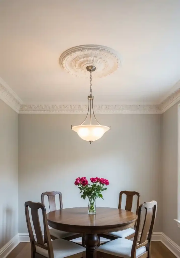 The ceiling rose at the center of a small dining room performs two functions simultaneously — it provides the architecturally correct and visually beautiful mounting point for a pendant light, and it creates a focal point on the ceiling plane that draws the eye upward and makes the ceiling itself feel like an intentional, considered architectural surface rather than a blank, ignored plane overhead. The decorative cornice running around the full perimeter reinforces this architectural intention by creating a clean, considered transition between wall and ceiling that adds visual height to the room rather than simply marking where one surface ends and another begins. Together, these two details transform a plain small dining room into a room of genuine architectural distinction.
