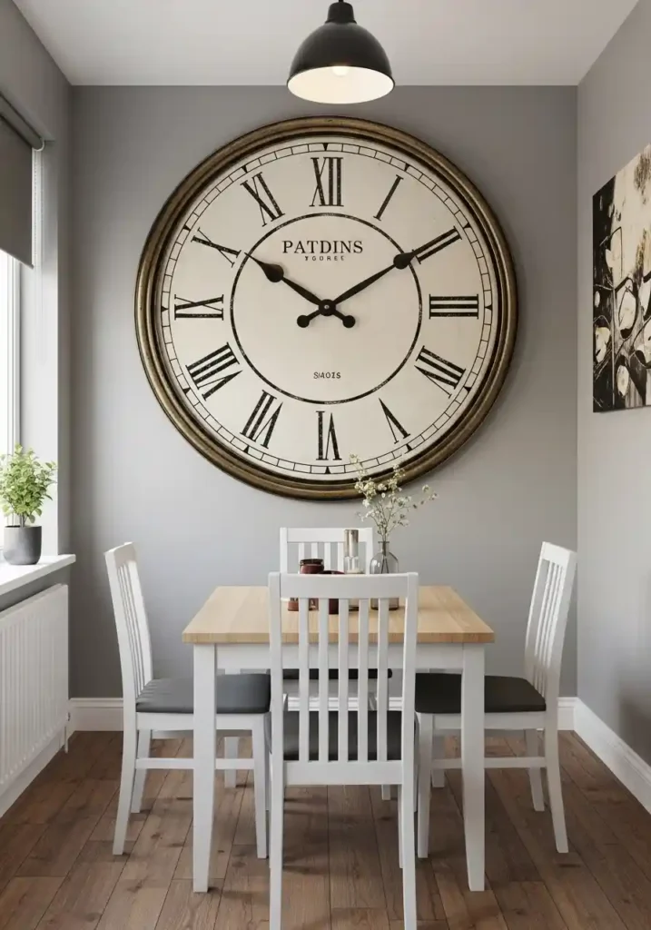 The style of oversized clock that works most magnificently in a small dining room is the one that speaks most directly to the room’s overall aesthetic and the personal taste of the people who dine within it — because an oversized clock is a genuine design statement that communicates personality with real clarity and real confidence. A vintage-style clock in aged brass with cream face and Roman numerals adds warmth, history, and timeless elegance. A minimal, graphic clock in matte black with clean Arabic numerals makes a bold contemporary statement. A botanical or artistic clock face creates the most direct overlap with conventional artwork. Choose one that you genuinely love looking at, because in a small dining room, the oversized clock is always, inevitably, the first thing every eye finds.