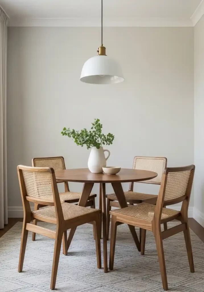 Cane-back dining chairs are the small dining room’s most visually intelligent seating choice after the fully transparent ghost chair — and for people who find the complete transparency of acrylic slightly too contemporary or slightly too clinical for their aesthetic, the woven cane back provides a beautiful, warm, organic alternative that achieves nearly the same spatial benefit through a different and arguably even more beautiful material expression. The open weave of cane creates visual transparency through the chair back — the eye sees through the chair to the wall behind it — and that transparency contributes to the room’s overall sense of openness and visual breathing space in a way that solid upholstered backs simply cannot.