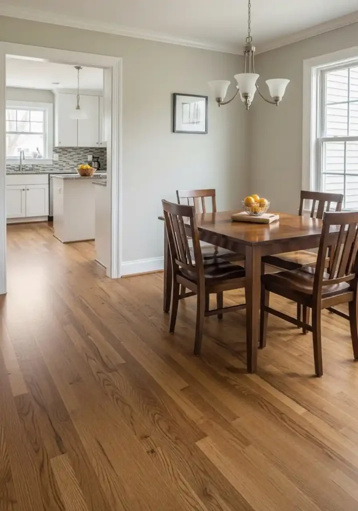 Continuous flooring — the same material, the same finish, the same color, and the same laying direction running without interruption from your small dining room into every adjacent space visible through open doorways — is the most powerful free spatial upgrade available to anyone planning a floor renovation or starting from scratch in a new home. When the dining room floor visually connects to the hallway floor, the kitchen floor, and the living room floor without any transition strip, threshold, or material change interrupting the visual flow, the dining room appears to exist within a much larger spatial whole rather than as a self-contained small room with defined and limiting edges. The eye borrows the visual space of the connecting rooms and the dining room feels genuinely larger as a result.