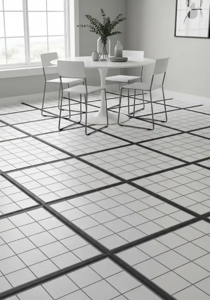 The specific combination of large white or very pale tiles with dark charcoal or black grout is the version of this technique that creates the most dramatic and most spatially effective result — because the high contrast between the pale tile faces and the dark grout lines makes the grid pattern maximally visible and maximally impactful. Large-format tiles — thirty by thirty centimeters or larger — create a more sophisticated, more contemporary pattern than small mosaic tiles, with fewer grout lines that read as more architectural and less busy in a small room context. The graphic tile floor pairs beautifully with simple, slim furniture above it, allowing the floor pattern to be fully seen and fully appreciated as the design element it has been specifically chosen to be.