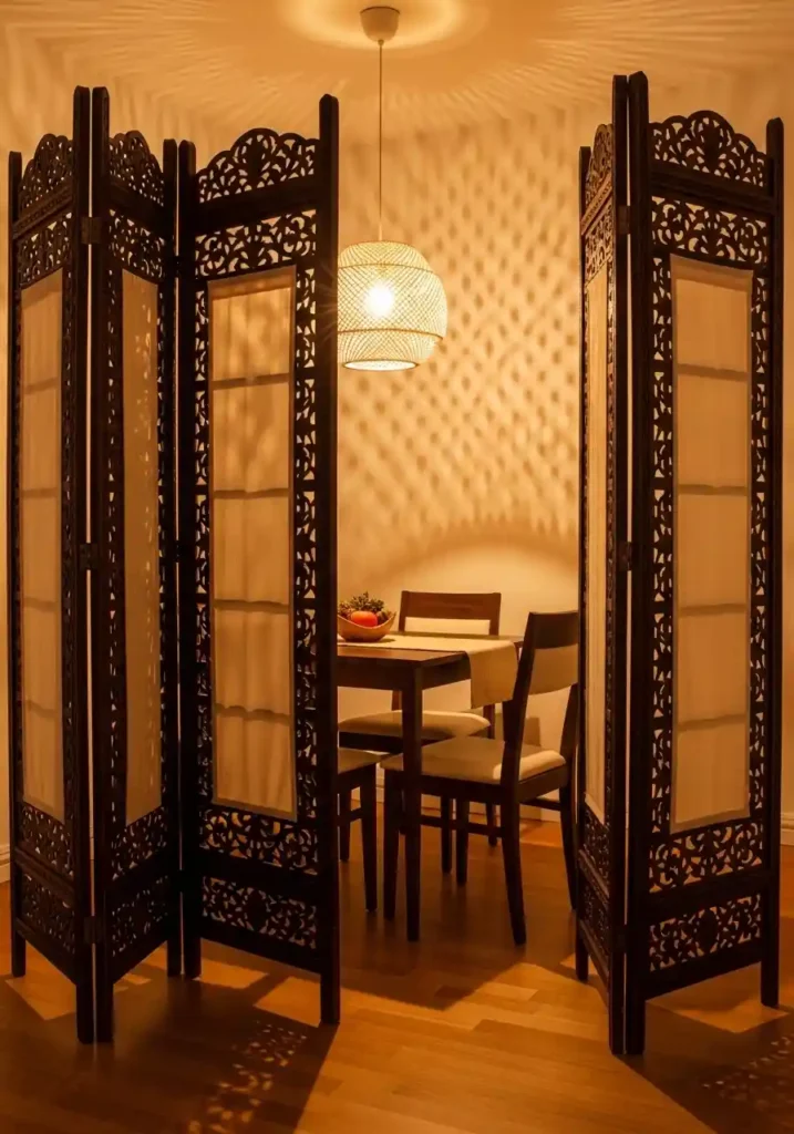 The folding screen’s decorative contribution to the room’s aesthetic is as significant as its zone-defining spatial contribution — and choosing one of genuine beauty rather than purely practical function is the decision that makes this piece a design asset rather than merely a functional solution. A carved dark wood frame with stretched ivory fabric panels creates shadow patterns of extraordinary beauty in warm candlelight. A Japanese-inspired lacquered screen in deep indigo with gold leaf detailing brings cultural richness and genuine artistic quality. A minimal, contemporary screen in natural oak with frosted glass panels achieves clean architectural zone definition with a sophisticated, contemporary restraint. Any screen of genuine beauty makes the small dining zone feel both more spacious in its definition and more special in its atmosphere.