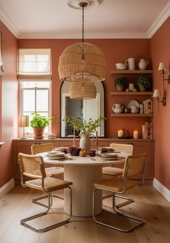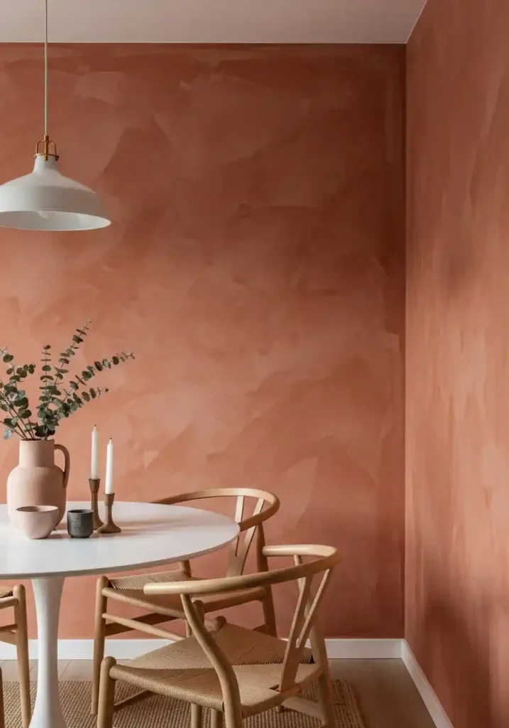 The specific quality that makes limewash most spatially beneficial in a small dining room — beyond its obvious aesthetic beauty — is the way its slightly matte, softly textured surface absorbs light rather than reflecting it harshly, creating a wall with a warmth and a depth that makes the room feel more enveloping and more genuinely intimate than a flat, bright-white or brightly colored smooth surface would. Warm terracotta limewash creates the most spectacularly beautiful and most instantly inviting small dining room atmosphere — the organic orange-brown of the terracotta tone combined with the texture of the limewash creates a wall that feels ancient, artisanal, and deeply, genuinely beautiful in a way that no manufactured finish can approach. Layer in natural wood furniture and handmade ceramic tableware and the room becomes something truly extraordinary.