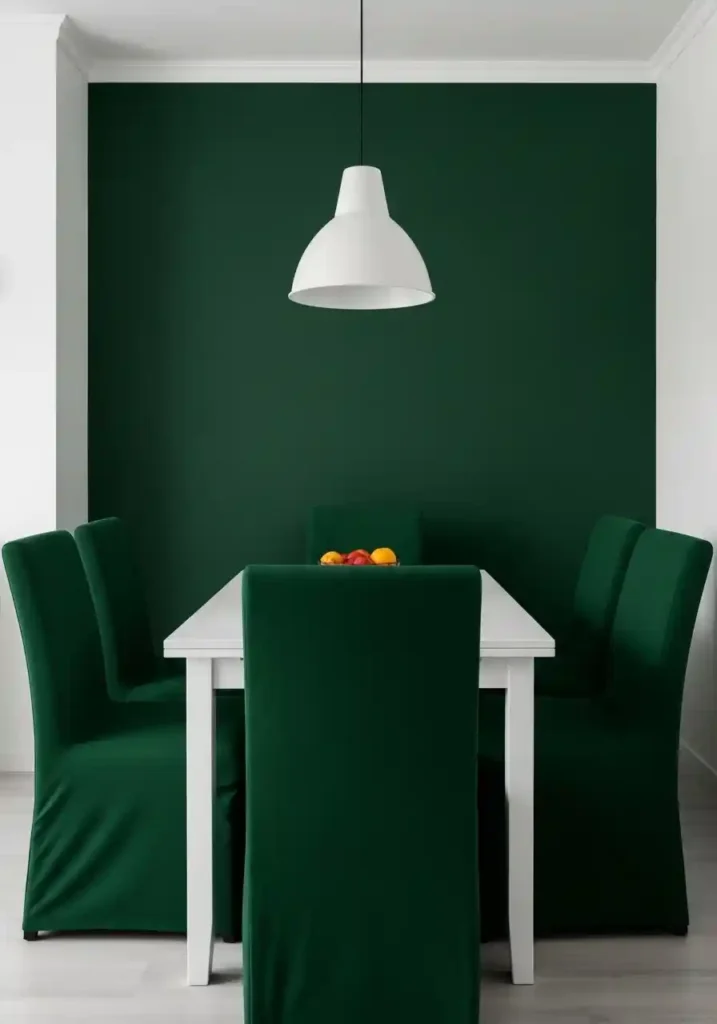 This technique — matching upholstery precisely to wall color to create furniture that visually merges with its backdrop — works most powerfully with deeper, more saturated wall colors rather than pale neutrals, because the stronger the color match and the more visually distinctive the shared color is, the more completely the chairs disappear into the wall and the more dramatically the spatial benefit registers. Deep forest green chairs against forest green walls. Midnight navy chairs against midnight navy walls. Rich terracotta chairs against terracotta walls. The white dining table at the center of this color-merging arrangement becomes the room’s sole visual focal point, floating in a sea of unified color with a clarity and a visual authority that makes the small dining room feel not just spacious but genuinely, magnificently designed.