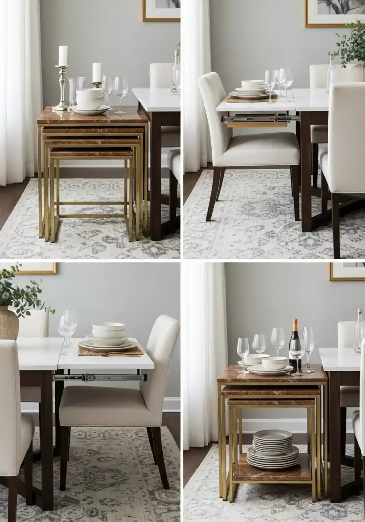 The small dining room’s greatest entertaining challenge is not the dining table itself — most compact dining tables can be extended or supplemented for occasional dinner parties — but the complete absence of any surface for serving dishes, drinks, and all the paraphernalia of a properly hosted meal that isn’t the dining table itself. A set of nesting side tables in a beautiful material combination — marble tops on brass legs, natural oak on black steel, glass on chrome — solves this challenge with total elegance, providing multiple additional serving surfaces that deploy instantly when needed and nest back into a beautifully compact, stylish footprint the moment the meal is over and the floor space is needed back.