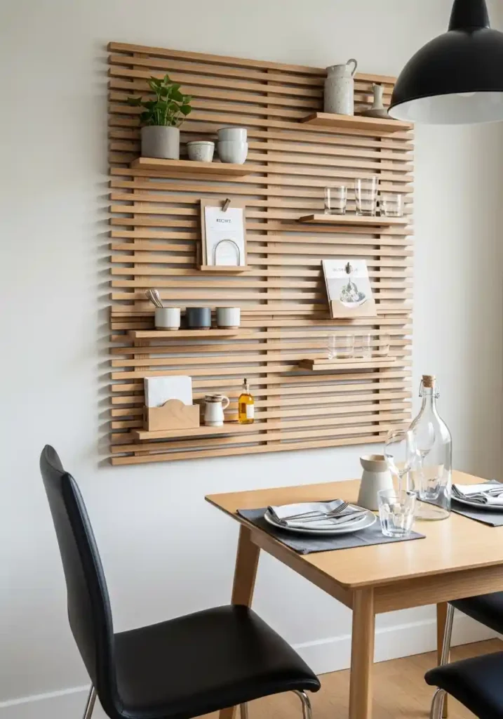 The material choice for a dining room slatted wall panel determines the aesthetic register it occupies in the room’s overall design story — and natural wood is consistently the most beautiful and most universally versatile choice. A panel of slim horizontal oak or walnut slats brings warmth, craft, and organic character to the dining room wall in a way that white pegboard or industrial metal systems cannot approach. Style the slats with the same editorial restraint that floating shelves require: a few carefully chosen ceramic objects, one small plant, essential dining accessories organized beautifully, and generous empty space between each grouping. The warmth of the natural wood combined with the clean organization of the display creates a wall of genuine beauty and genuine function simultaneously.