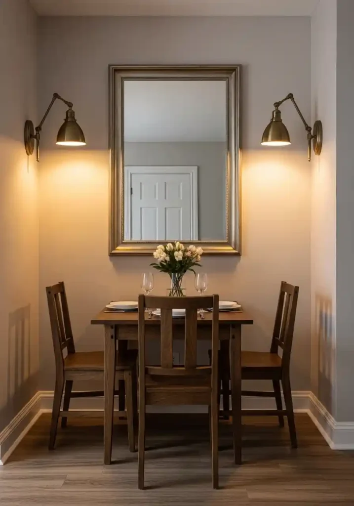 Wall sconces in a Small Dining Room Decor Ideas are the lighting solution that most people never consider and almost everyone wishes they had discovered sooner — because mounting your secondary light sources directly onto the wall eliminates the floor lamps and table lamps that consume precious floor area and surface space in rooms that genuinely cannot afford to spare either. Two beautiful wall sconces flanking a mirror or a piece of artwork do everything a pair of table lamps would do in terms of warm, directional, atmospheric light — and they do it without occupying a single inch of the floor plane or a single inch of the sideboard surface below them.