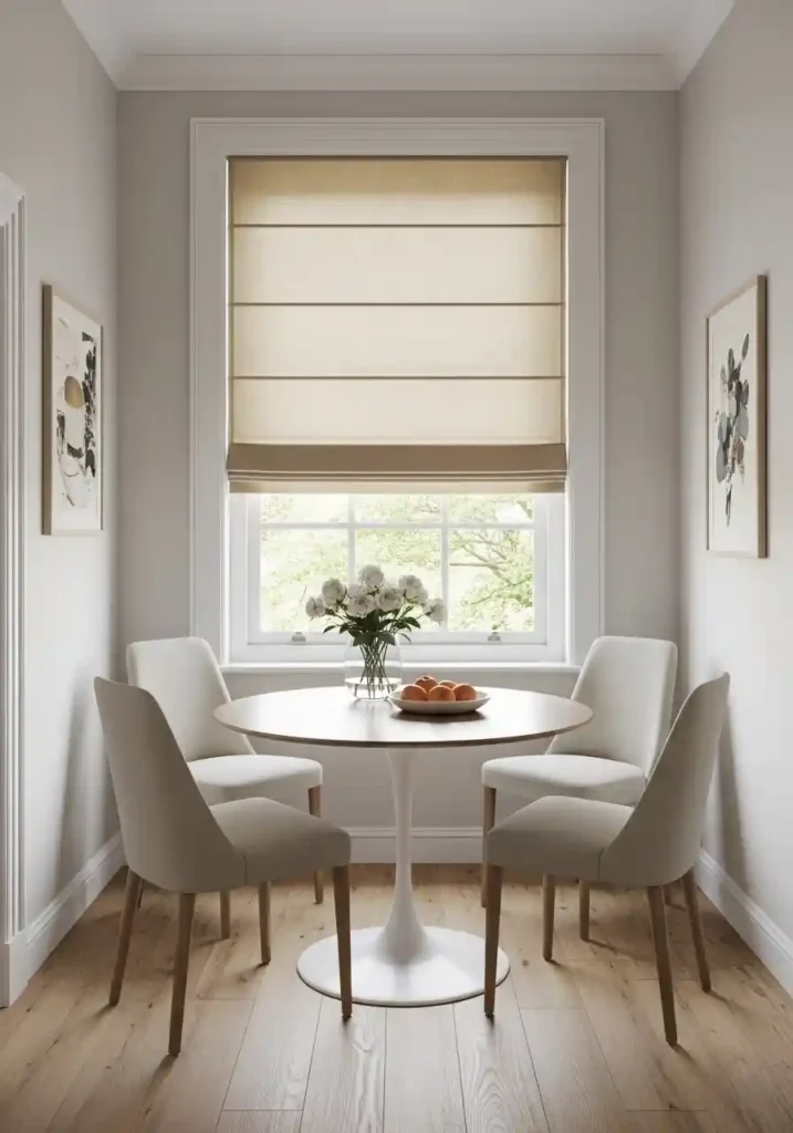 Full curtains in a small dining room — however beautiful the fabric, however carefully chosen the color — consume wall space on either side of the window when open that a compact dining room genuinely needs to feel wide, open, and unencumbered. Roman blinds provide every bit of the privacy, the light control, and the window dressing elegance that curtains deliver, while occupying only the window opening itself when rolled down and rolling neatly and completely out of the way when up, leaving the walls on either side of the window completely free, completely visible, and completely available to contribute to the room’s sense of generous, open width.