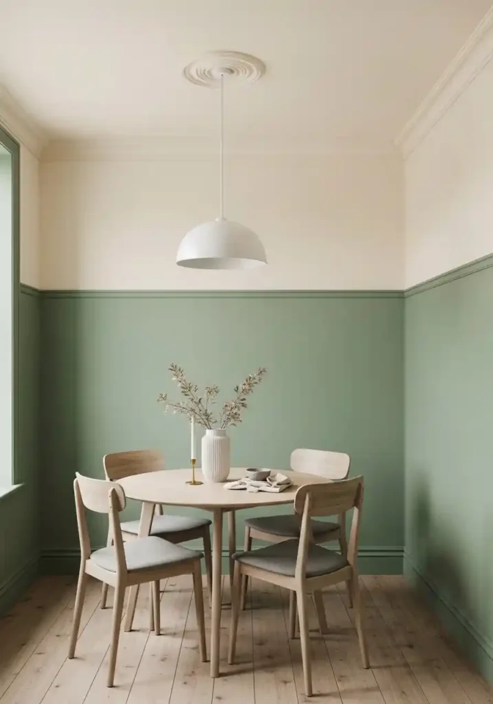 The painted picture rail or chair rail that marks the transition between the two tones is the architectural detail that elevates this technique from a simple paint job into a genuinely considered design feature — and it’s a detail worth executing with care. A slim painted timber molding at the transition point, painted in either the upper or lower tone, creates a clean, precise boundary that makes the two-tone treatment look intentional and architectural rather than unfinished or accidental. The lower tone in sage green, terracotta, dusty navy, or warm taupe combined with a warm white upper zone and ceiling creates the most beautiful and most spatially effective results in small dining rooms of virtually every style and proportion.