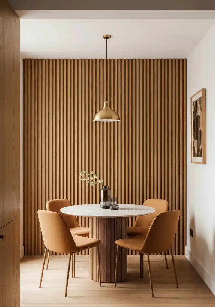 A slatted wall panel — a grid of horizontal wooden slats or a pegboard system finished in a beautiful material — in a small dining room is the organizational and display solution that the most design-forward, most spatially intelligent small dining rooms are embracing as an alternative to both closed cabinetry and conventional open shelving. The slatted system provides completely adjustable, completely flexible storage and display capacity that can be reconfigured as needs change, holds everything from slim shelves to hooks to small baskets to plate holders, and does all of this while looking like a genuinely beautiful, genuinely considered architectural wall feature rather than a storage system that was installed out of spatial necessity.