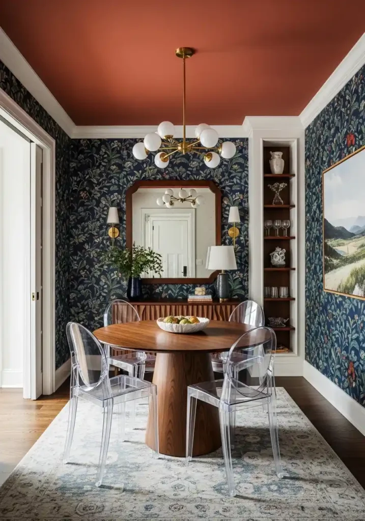 A deep color-drenched ceiling in a small dining room is the design decision that most brilliantly converts the compact room’s most potentially problematic quality — its low ceiling — from a spatial limitation into a genuine, warm, deliberately beautiful design asset, because a ceiling painted in a rich, saturated color creates a quality of intimate, cocooning warmth that makes the low ceiling feel like a deliberate choice of architectural intimacy rather than an inevitable consequence of limited building height. The color-drenched ceiling transforms the small dining room’s dimensional constraint into one of its most distinctively beautiful and most personally expressive design qualities.