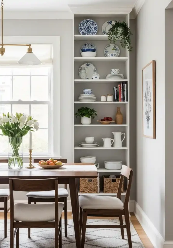 Vertical floor-to-ceiling storage in a small dining room is the space-maximizing strategy that most effectively and most permanently increases the compact dining room’s storage capacity without consuming additional floor area — because a bookcase or shelving unit that extends from the floor to the absolute ceiling height captures every inch of available vertical dimension for organized storage rather than leaving the upper portion of the wall empty and unused. Floor-to-ceiling shelving in a dining room alcove provides a volume of organized dining storage that dramatically exceeds what any lower shelving or sideboard alternative of equivalent floor footprint could accommodate.